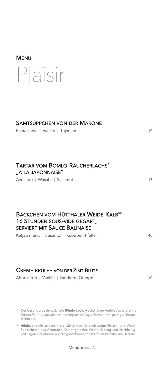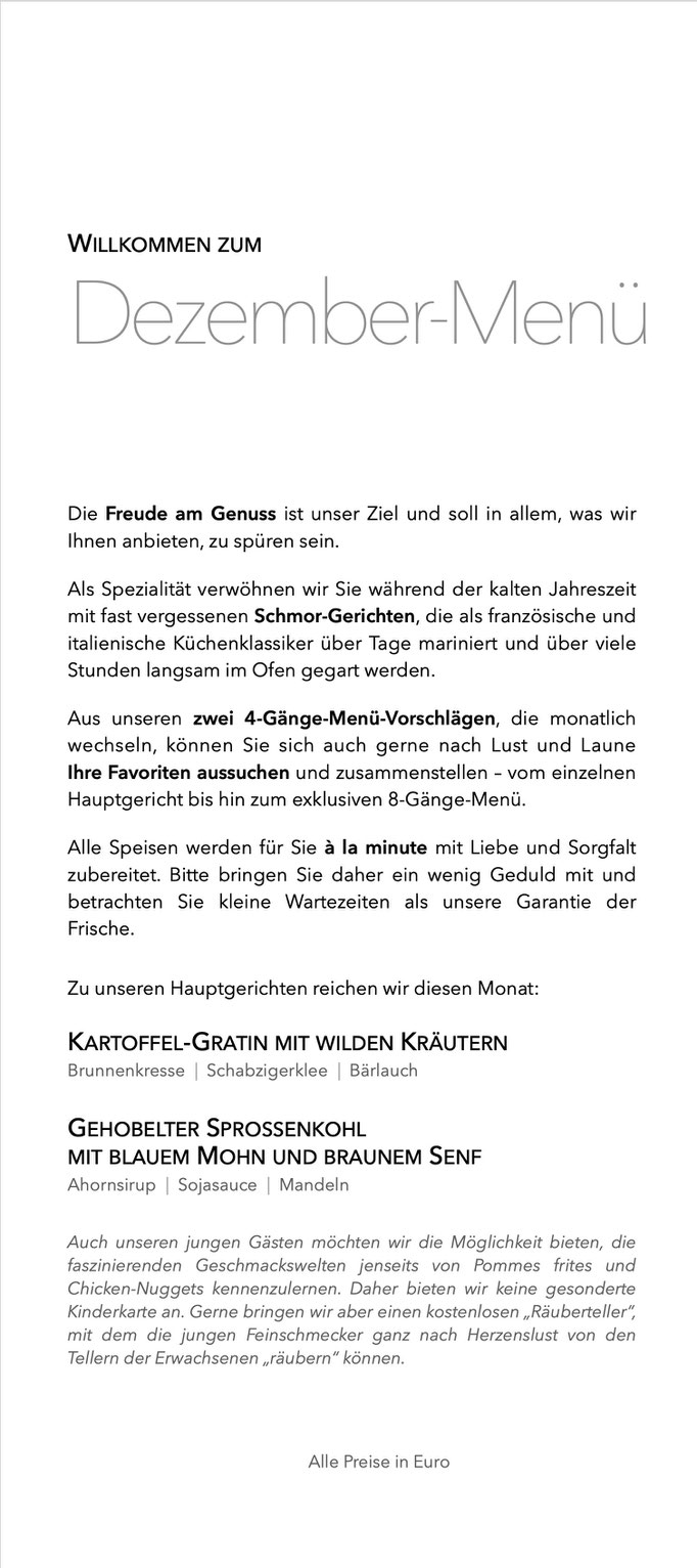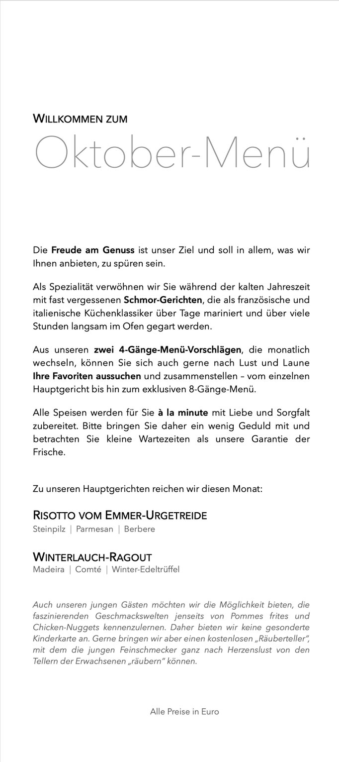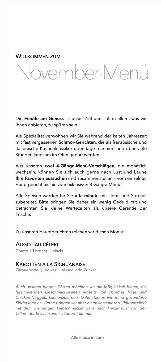 Jeden Monat stellen wir zwei neue 4-Gänge-Menü-Vorschläge zusammen, die jeweils eine kulinarische Geschichte erzählen (z.B. über eine besondere Zutat oder eine besondere Zubereitungsmethode). Gerne können Sie sich aber auch einzelne Gänge aussuchen und daraus Ihr Lieblingsmenü zusammenstellen – vom einzelnen Hauptgericht bis hin zum exklusiven 8-Gänge-Menü.